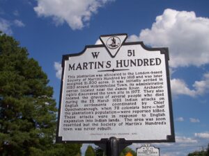 The site is on the James River near Williamsburg. An English settlement called Martin’s Hundred had been established here in 1618. During the 1970’s an archeological investigation began which extensively researched this early settlement and, subsequently, clarified much of the settlement’s history. About 1623 the occupants of Martin’s Hundred suffered a massacre. Those surviving appear to have vanished.